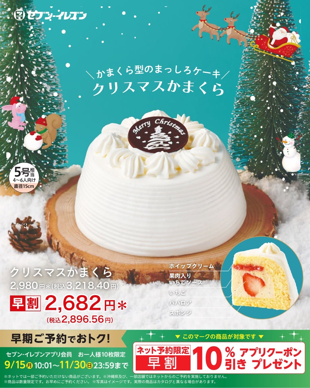 今回の案内では、クリスマスケーキの予約受付中であることに加え、ネット予約限定の早割10%OFFが打ち出されています。セブン-イレブンのオリジナル商品として、毎年人気のあるケーキが中心です。